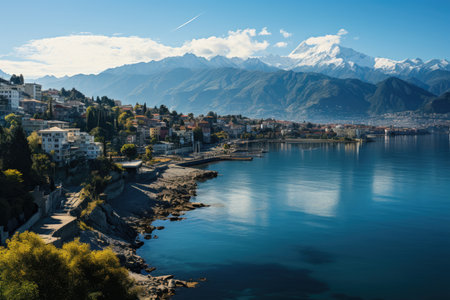 Sunny day on Lake Como and the small town of Lecco in Lombardy, Northern Italy. View of Bell tower of the Basilica of St Nicholas and Bergamo Alps.