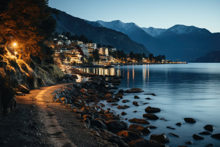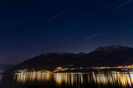 Illuminated Alpine Lake Maggiore at Night with Snow-capped Mountain in Ticino, Switzerland.