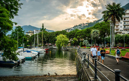 Locarno Switzerland, 1 July 2020: People on Locarno promenade on the shore of Lake Maggiore at sunset with marina view in Locarno Ticino Switzerland