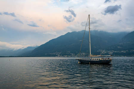 Sailing boat in middle of lake Maggiore at dusk at the border between Italy and Switzerland