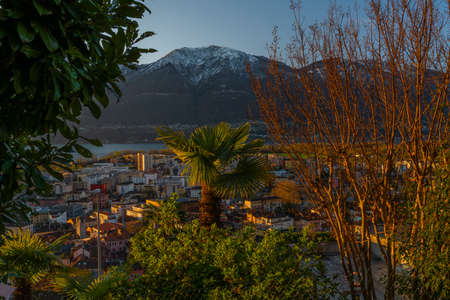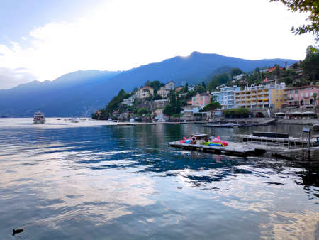 Locarno Switzerland, 1 July 2020: Locarno marina and Lake Maggiore view at sunset in Locarno Ticino Switzerland