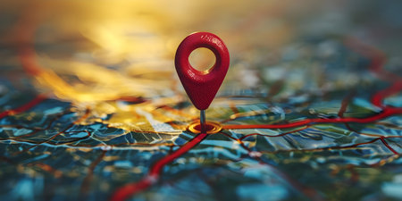 A red map marker is placed on a detailed map, highlighting a specific location. The composition features a shallow depth of field, emphasizing the marker and its surroundings. The map displays detailed lines and colors, while the lighting creates shadows and highlights, suitable for commercial applications.