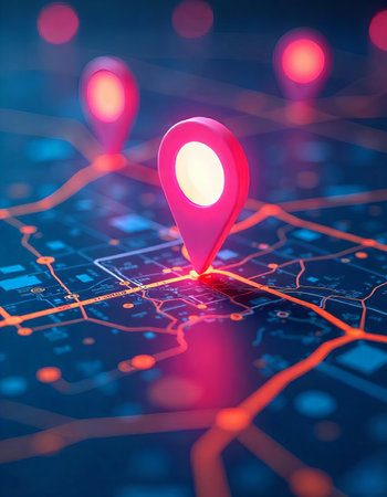 A vibrant digital map interface with prominent pink location pins, representing navigation, tracking, and destination setting in an interconnected world.
