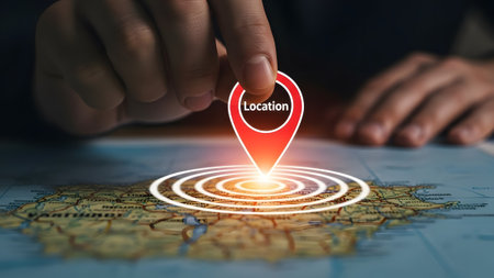Hand holds a red location pin with the word Location over a map with glowing circles. Clear det...
