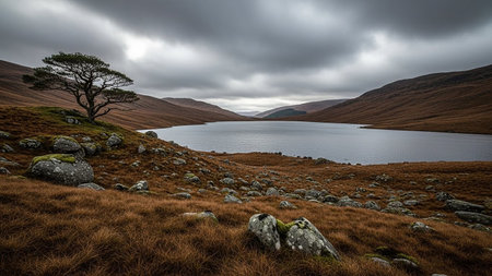 A lone pine tree stands on a brown, grassy hillside overlooking a calm lake under a dramatic, cloudy sky in a remote landscape.