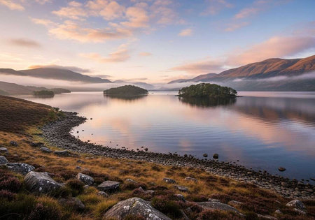 A serene lake surrounded by mountains and islands at sunrise or sunset with calm water and reflections