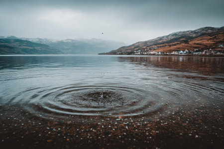 Tranquil scene of a loch with ripples spreading out from a splash. Mountains, a distant village, and a cloudy sky complete the picturesque setting.