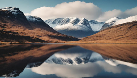Snowy mountains reflected in the lake, Scotland, United Kingdom.