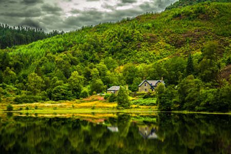 Lonesome House At Calm And Smooth Lake In Scotland