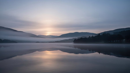 Peaceful sunrise over calm lake with mirrored reflections of trees and hills in soft light