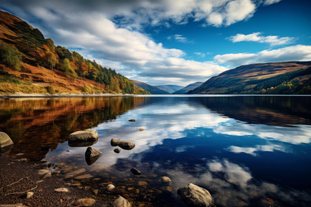 Beautiful autumnal image of a lake adjacent to a hilly woodland with the sky in the distance