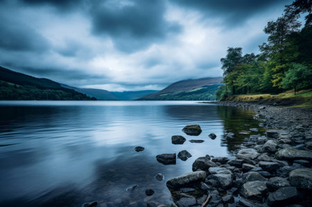 Darkening clouds gathering over a calm lake in scottish highlands