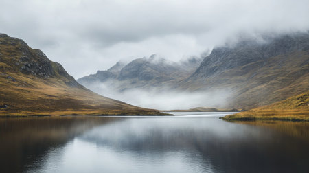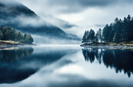 Mountain lake landscape with misty vibes