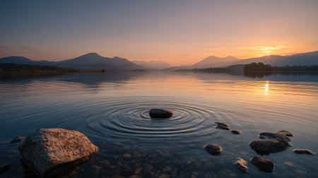 The scene shows a tranquil lake at sunset with ripples emanating from a stone. Mountains surround the calm water creating a peaceful atmosphere.