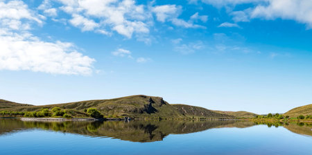 Beautiful landscape with mountain lake and blue sky with clouds in sunny day