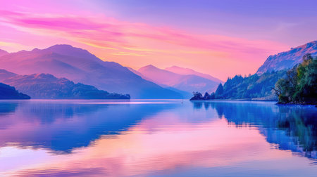 A breathtaking view of a calm lake at sunrise, framed by majestic mountains and vibrant sky colors, creating a serene atmosphere perfect for relaxation.