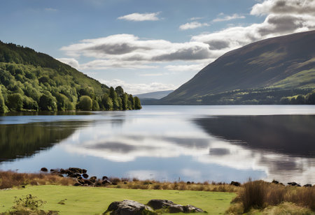 Scottish Highlands Landscape. Mountain range reflections on a lake in Scotland ona sunny day.