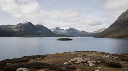 Scenic view of the Loch Glascarnoch and the surrounding hills on a spring sunny day as viewed from the Glascarnoch Dam in Scotland, UK
