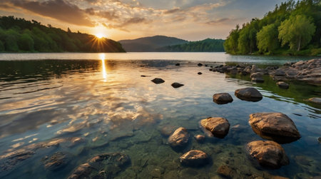 A serene lake with a beautiful sunset reflecting on the water. The rocks on the shoreline add to the peaceful atmosphere