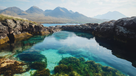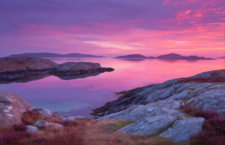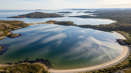 Calm showing serene coastal landscape featuring a tranquil bay with calm, reflective water mirroring the sky and surrounding islands dotted with vegetation and...