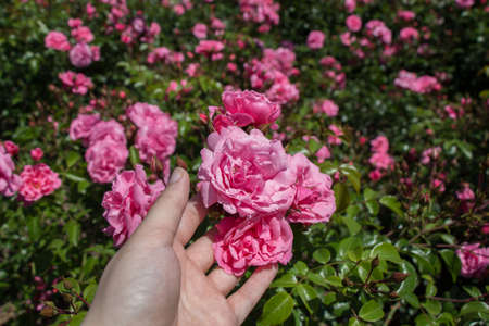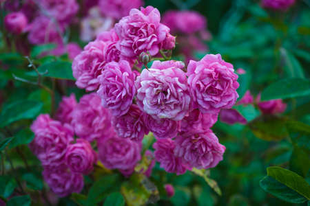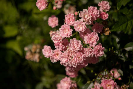 Bush of roses on bright summer day. Rose flower on background blooming pink roses flower in the garden of roses. Nature. Soft focus