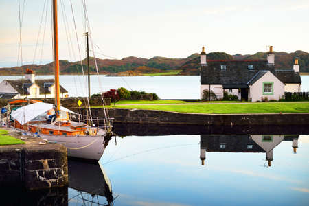 Crinan canal at sunrise. Colorful morning clouds and warm sunlight. Country houses and yachts close-up. Argyll and Bute, Scotland, UK
