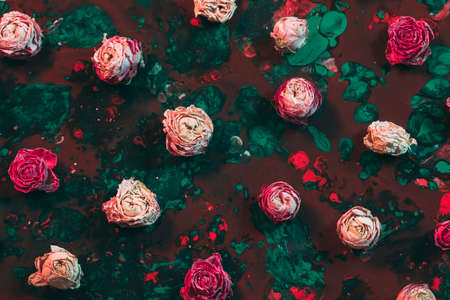 Abstract floral art background. Flat lay arrangement of pink dried rose buds on red and emerald green paint.