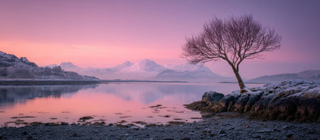 A serene landscape features a leafless tree on a rocky shoreline reflected in calm water. The composition is bathed in soft, warm hues of pink and purple, with a mountain range in the background. This image could be used for various projects, including editorial features or commercial designs.