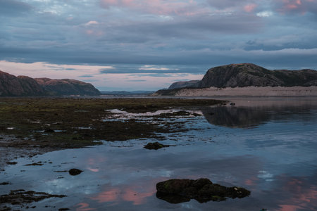 Sunset on the shore of the Barents Sea in Teriberka