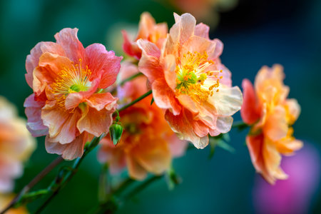 inflorescence of a bush of a rose of coral color on a dark green background. flowers close-up with selective focus.