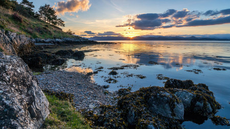 The sun sets on the horizon, casting warm hues over calm waters as clouds drift in the sky. Rocky shores and vibrant seaweed create a picturesque coastal view at dusk.