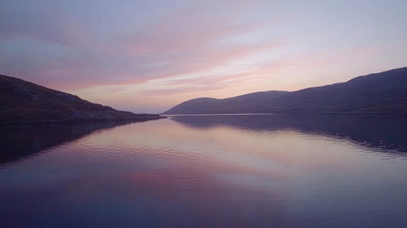 Serene coastal landscape at dusk reflecting vibrant pink and purple hues on calm water
