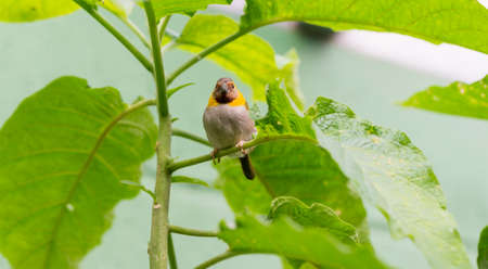 Bright and yellowish male Asian Golden Weaver perching on dried perch, looking into a distance