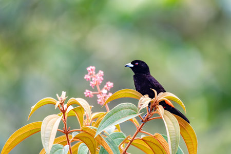 Black and red bird Scarlet-rumped tanager (Ramphocelus passerinii) feeding. Quepos, Wildlife and birdwatching in Costa Rica.