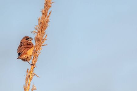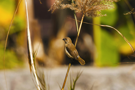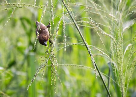 Bronze mannikin bird sitting in stems of grass to eat some fresh seeds