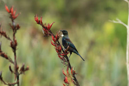 Tui bird sitting on cabbage tree on Tiritiri Matangi Island