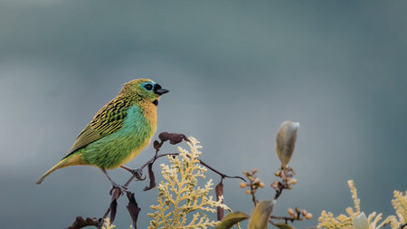 Tropical bird, Palm Tanager perched on a branch with a background of blue sky and orange flowers.