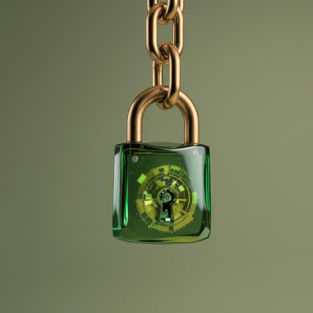 Green transparent padlock with an intricate, glowing cybernetic keyhole mechanism, hanging from a sturdy golden chain. symbolizes digital security, data protection, and online privacy.