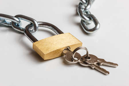 A combination lock on a metal chain. Keys are attached to the end of the chain. Selective focus. Copy space.