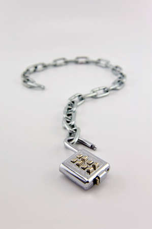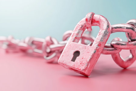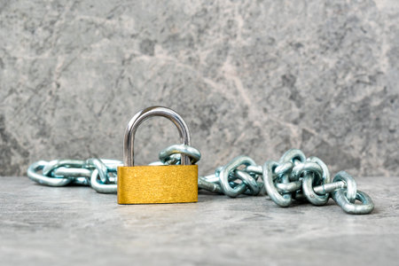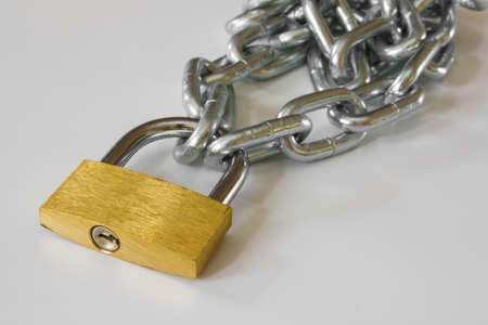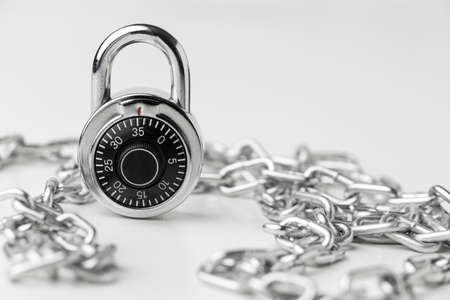 Minimalistic shot of a padlock and chains on a light-colored background, focusing on simplicity in security.