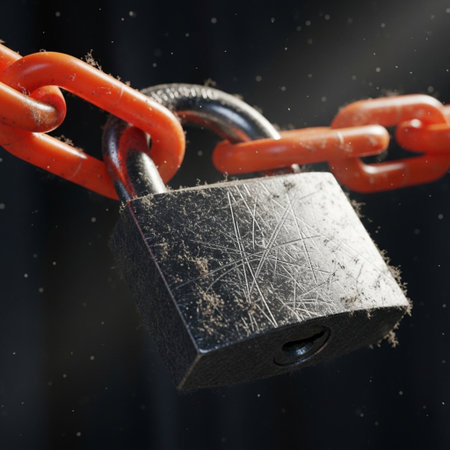 Heavy-duty padlock and chains with water droplets, evoking resilience and protection in harsh conditions.
