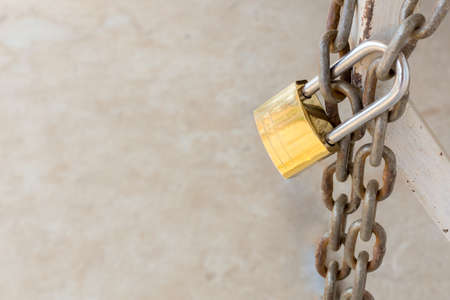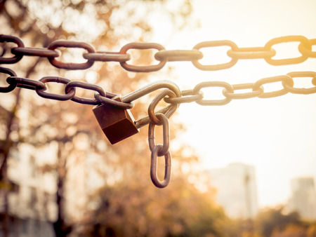 Selective focus on lock with rusty chain with blurry background (warm tone color)