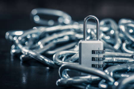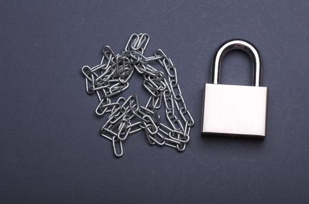 closed padlock connects metal chains on a blurred background. Business concept. Cover. Background for design.