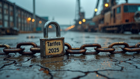 That the image is generated using AI. Rusty padlock on chain in industrial shipyard with tariff warning for 2025.