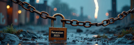 That the image is generated using AI. Chain and lock symbolizing economic recession 2025 in stormy weather.