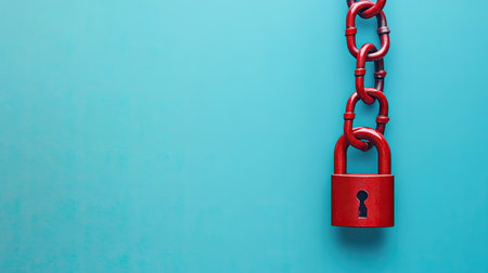 Red chain with a locked padlock on a blue background, representing security with ample space for copy or logos