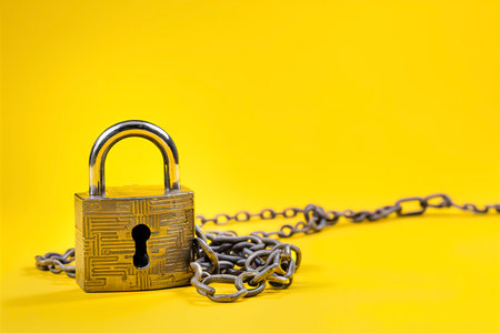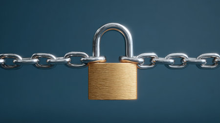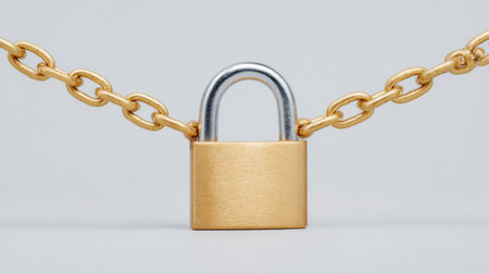 A robust silver chain with polished surfaces encircles a resilient golden lock, conveying themes of safeguarding and resilience through its reflective textures and sturdy