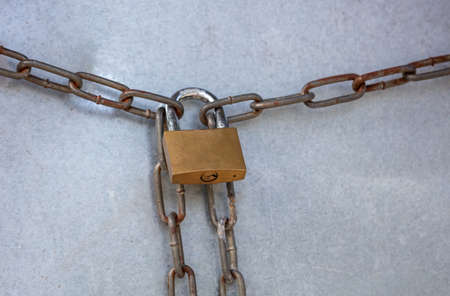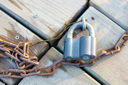 Old padlock on a rusty chain close-up. The concept of protection, safety, security.