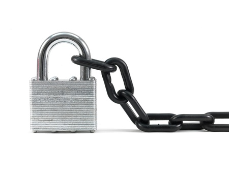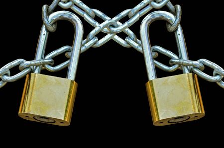 Chain and padlock on an isolated background. A locked padlock hangs on a chain. closed door. secret room. metal chain.