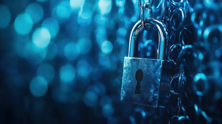 Closeup of a metallic padlock on illuminated chains with blue bokeh background, symbolizing data security